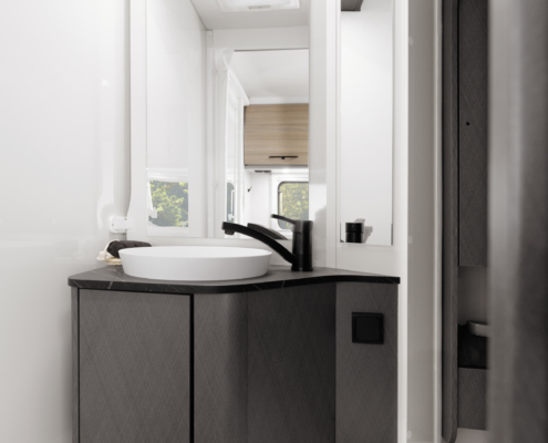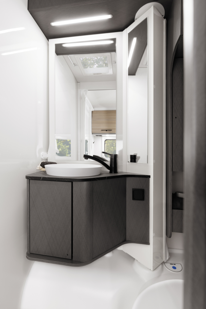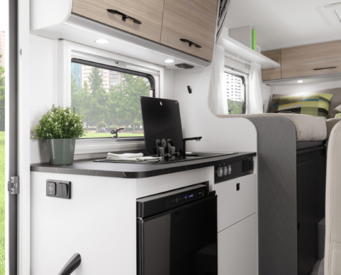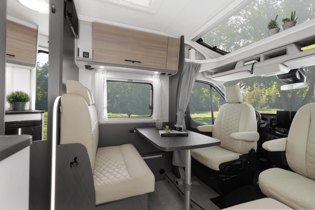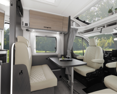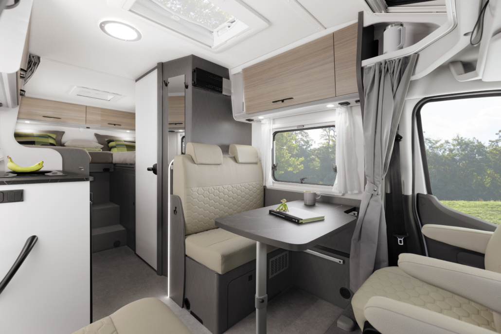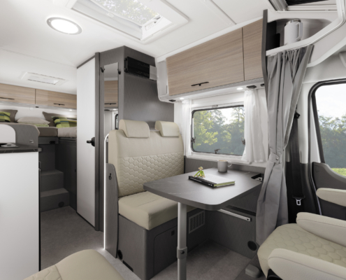 Chassis Paket, FORD 16″ Alufelgen schwarz, Fenster in T-Haube, Rahmenfenster, Abwassertank isoliert, Markise (manuell) 4 m, Gehäuse in anthrazit, Vorbereitungen für TV-Kabel 12V und TV-Halterung, Vorbereitung Dachklimaanlage, Vorbereitung Solaranlage, Automatikgetriebe, Elektrische Vorbereitung für Anhängekupplung, Isofix Kindersitzbefestigung für hintere Sitzbank, Heizung Combi 6 E (mit Elektroheizstab) inkl. digitales Bedienpanel, Fußbodenerwärmung elektrisch im begehbaren Bereich, Vorbereitung Dachklimaanlage,